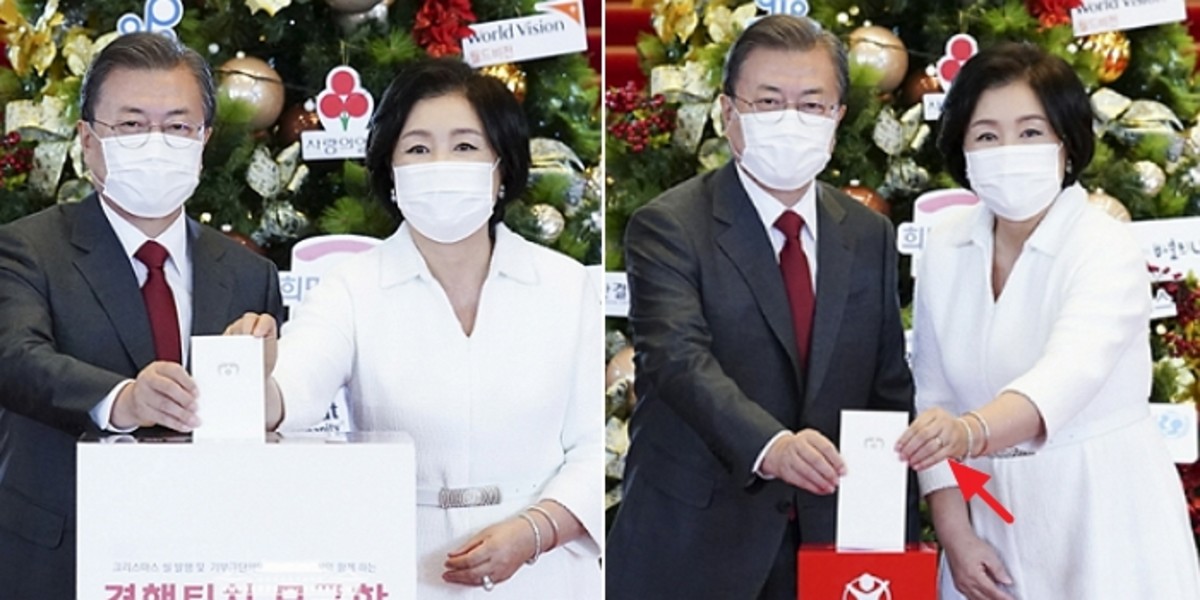 김 여사는 해당 반지를 착용한 채 각 단체의 모금함에 성금 봉투를 넣었는데, 어느 순간부터는 반지 알이 없는 밋밋한 반지를 착용한 모습이 포착됐다.