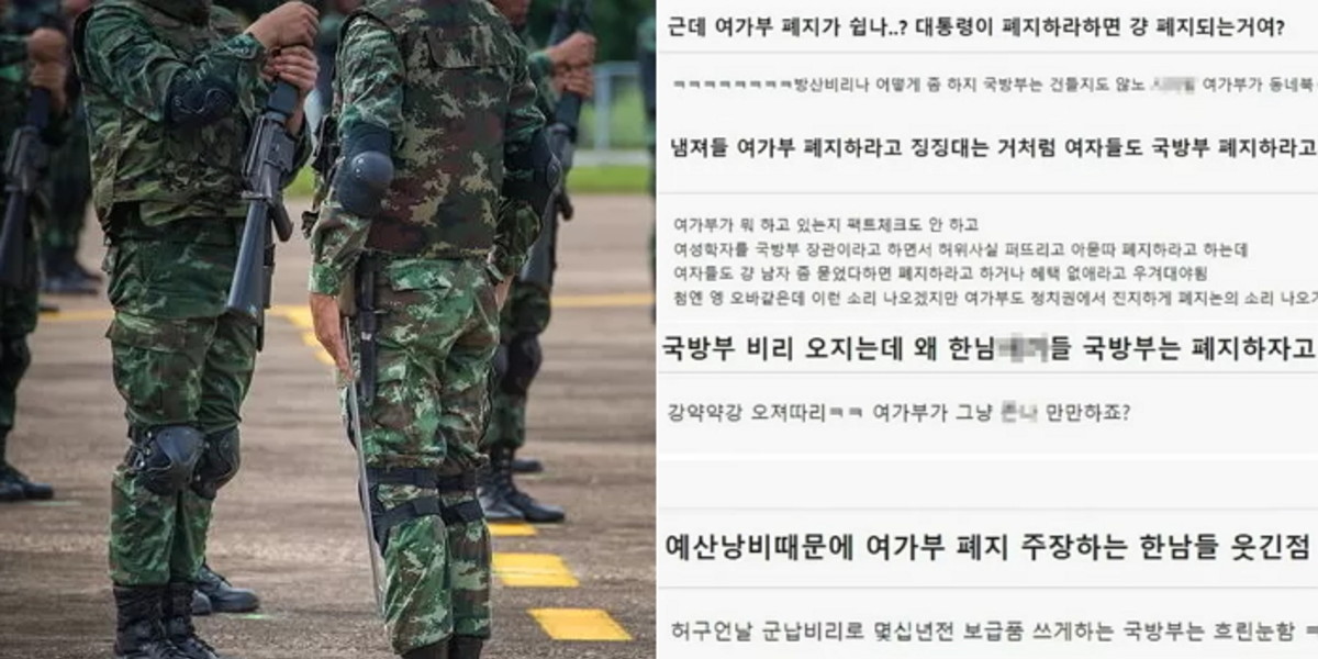 이외에도 "예산 낭비 때문에 여가부 폐지 주장하는 남자들 군납 비리로 몇십 년 전 보급품 쓰게 하는 국방부는 흐린눈 한다", "국방부는 왜 폐지하자고 안 하냐. 강약약강이다" 등의 글이 올라왔다.