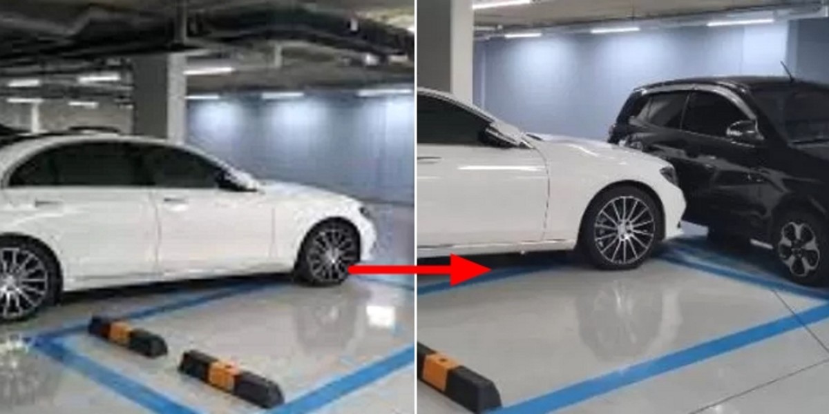 이 때문에 벤츠 차량 옆 주차 자리에는 다른 차가 들어갈 수 없는 상황이다. 이에 A씨는 자신의 차를 이용해 그 앞을 막아 버리는 걸로 응수했다.