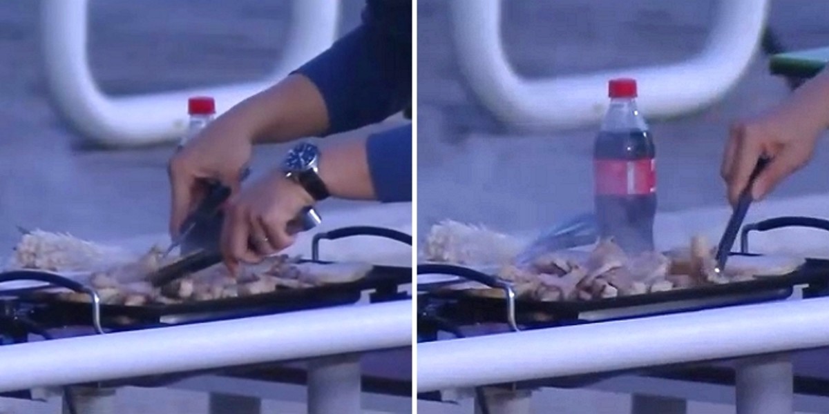 경기장에서 삼겹살이 구워지고 있는 강렬한 비주얼에 카메라맨은 약 10초간 해당 장면을 비춰줬다.