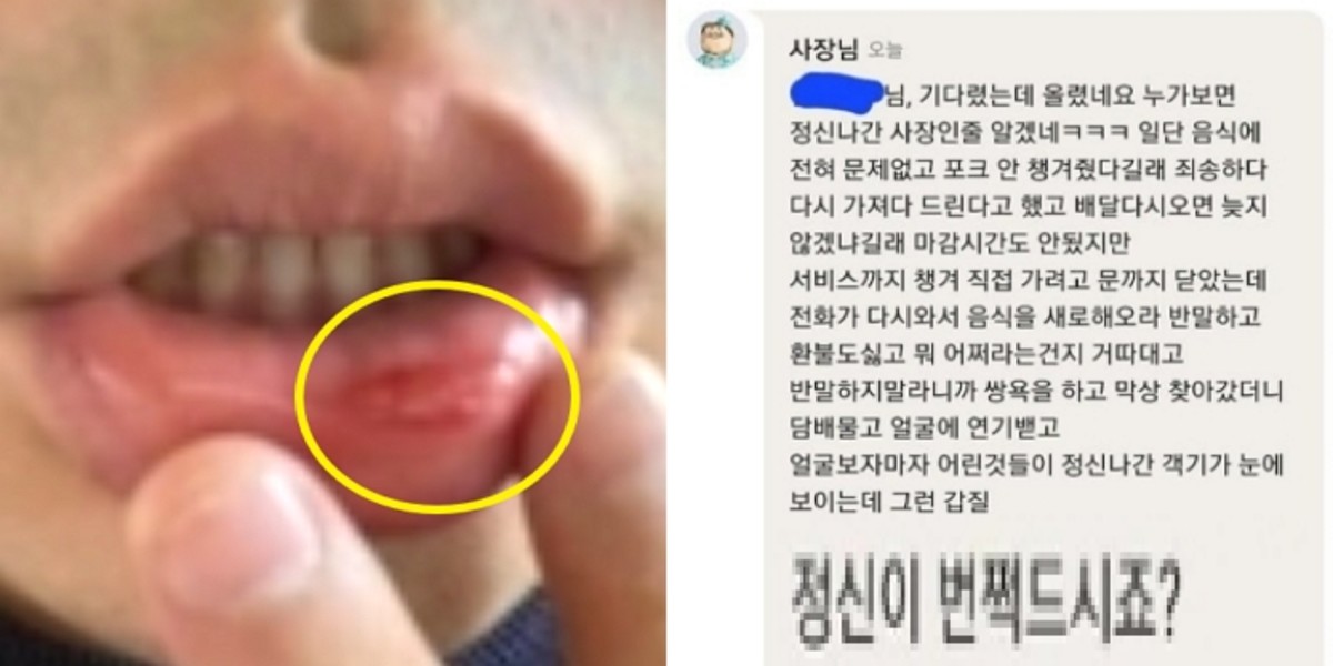 리뷰에 따르면 고객 A씨는 포크를 가져다 달라고 요청했다가 폭행을 당했다며 상처 난 입술 사진을 함께 게시했다.