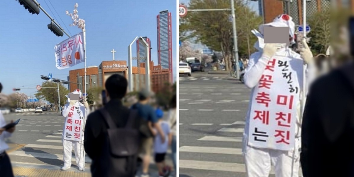 사진을 공개한 A씨는 당시 상황에 대해 "한국 사람인데 일본 꽃인 '사쿠라'를 보고 즐기는 게 믿기지가 않는다며 1인 시위를 하고 있다더라"고 설명했다.