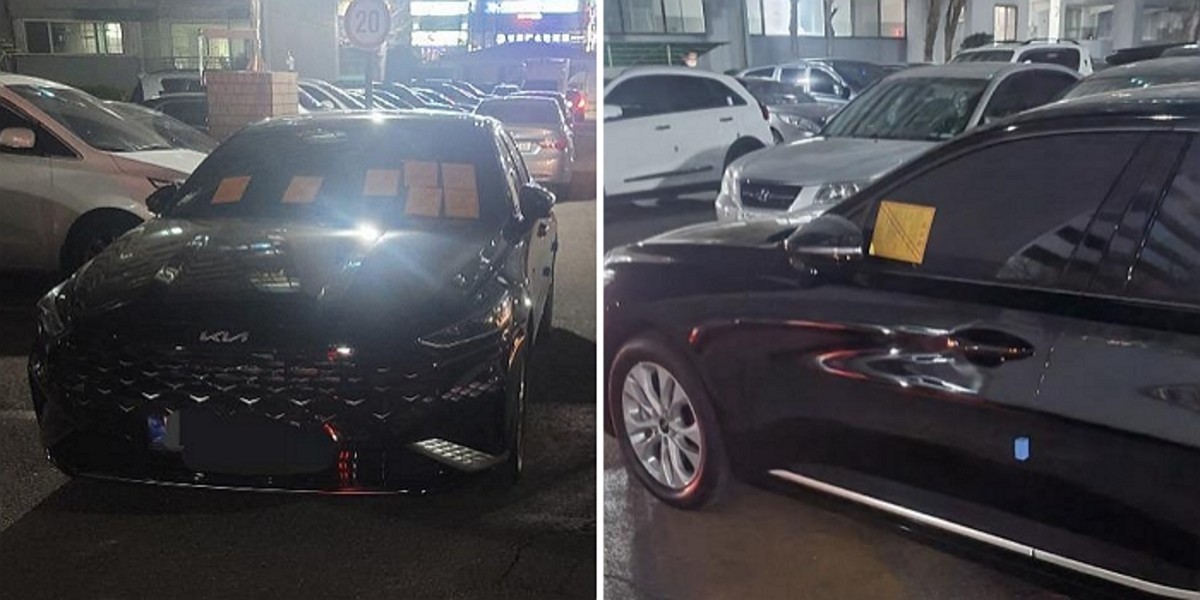 앞 유리에는 무려 7대의 주차 딱지가 붙어있어 운전석의 시야를 완벽하게 차단했다.