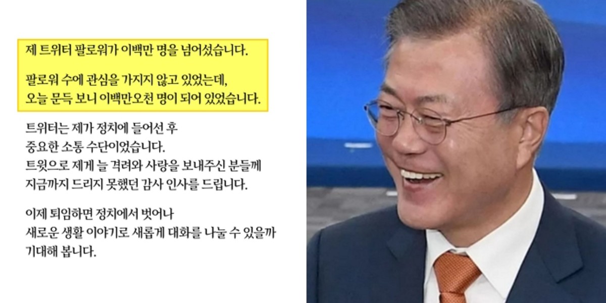 문 대통령은 "트위터는 제가 정치에 들어선 후 중요한 소통수단이었다"며 "트윗으로 제게 늘 격려와 사랑을 보내주신 분들께 지금까지 드리지 못했던 감사 인사를 드린다"고 했다.