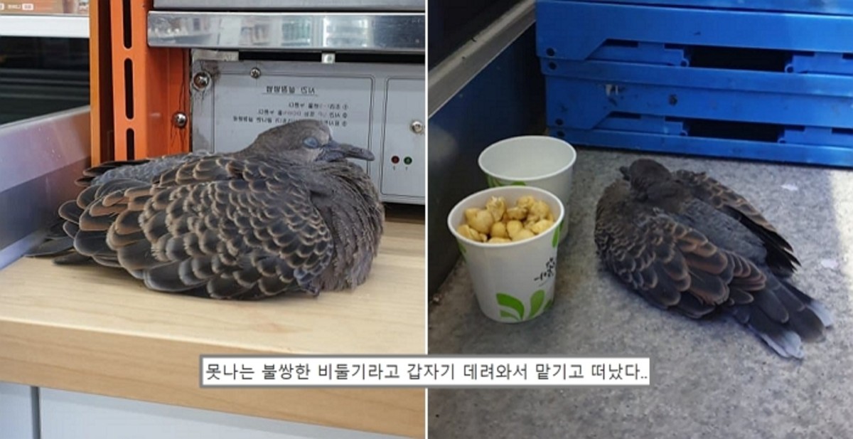 [인사이트] 임우섭 기자 = 한 편의점 알바생이 모르는 손님으로부터 비둘기 한 마리를 건네받았다며 사진을 게재했다.