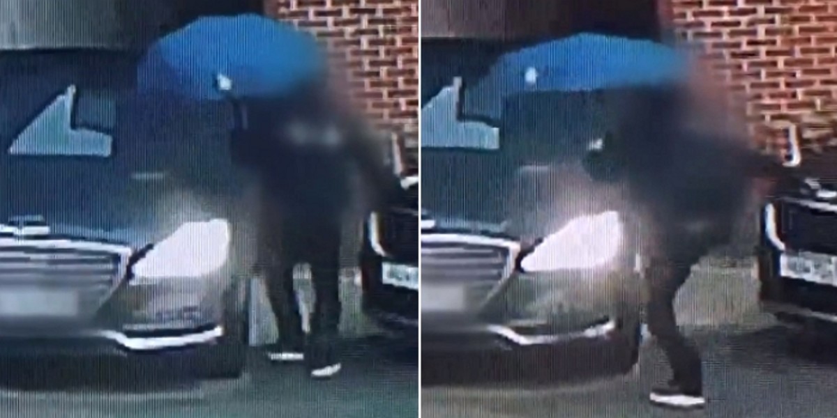 이때 우산을 쓰고 길을 걷던 한 남성은 발길을 돌려 이 차량으로 다가갔다. 남성은 갑자기 자동차 앞부분을 막무가내로 걷어찬다.