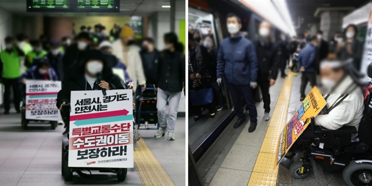 지난 5일 1호선 시청역 승강장에서 서울시 휠체어리프트 추락사고 책임 공식사과 및 장애인탈시설지원조례 제정을 촉구하며 선전전을 벌인 전장연 회원들 / 뉴스1
