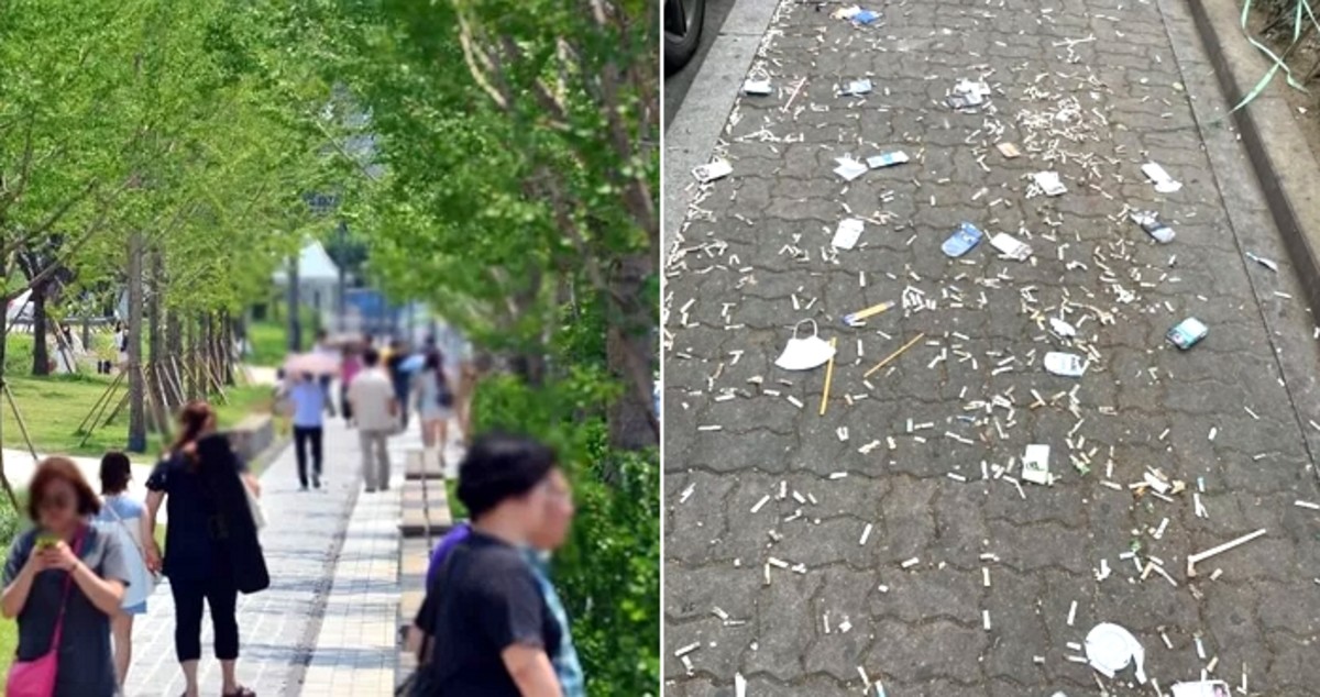 사진을 보면 버려진 담배꽁초와 담뱃갑이 널려있는 것을 넘어서 인도를 아예 뒤덮고 있다.