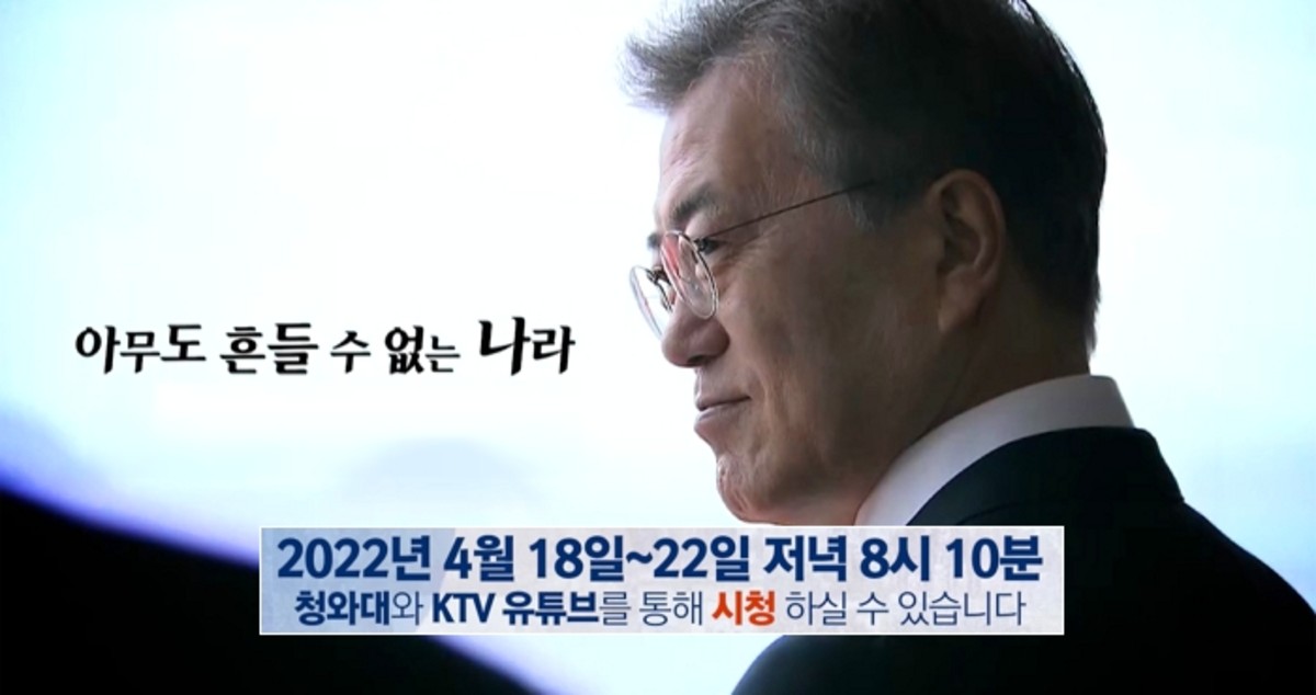 지난 18일 청와대는 청와대와 KTV가 영상백서 일환으로 공동기획한 '문재인 정부 5년의 기록, 아무도 흔들 수 없는 나라'가 19일 오후 8시 10분에 공개된다고 밝혔다.