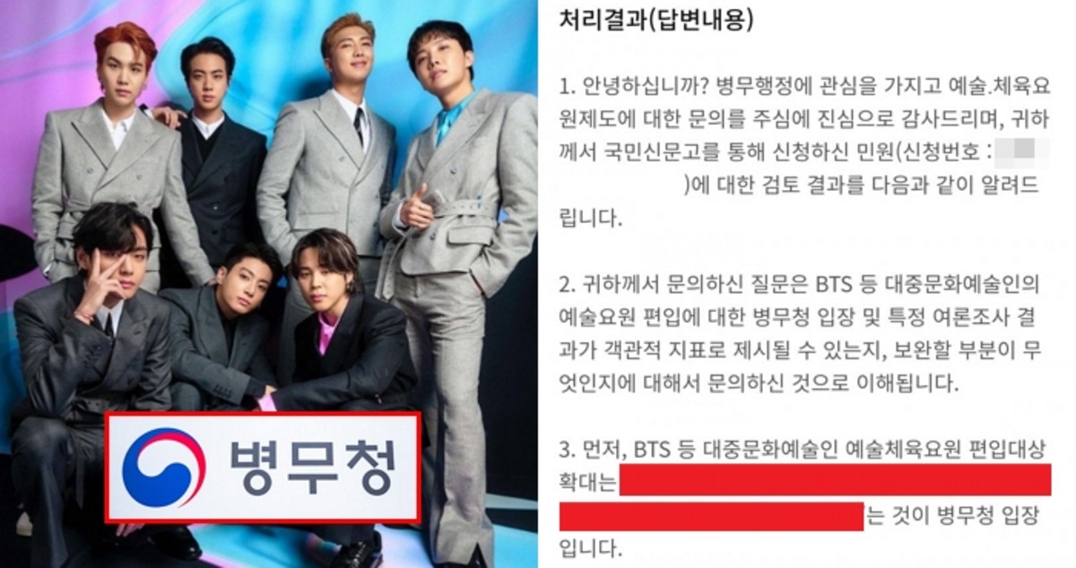 A씨의 질문에 대해 병무청은 "BTS 등 대중문화예술인 예술체육 요원 편입 대상 확대는 '객관적 기준 설정, 형평성 등을 고려하여 관계 부처와 함께 신중한 검토가 필요하다'는 것이 병무청 입장'이라고 밝혔다.