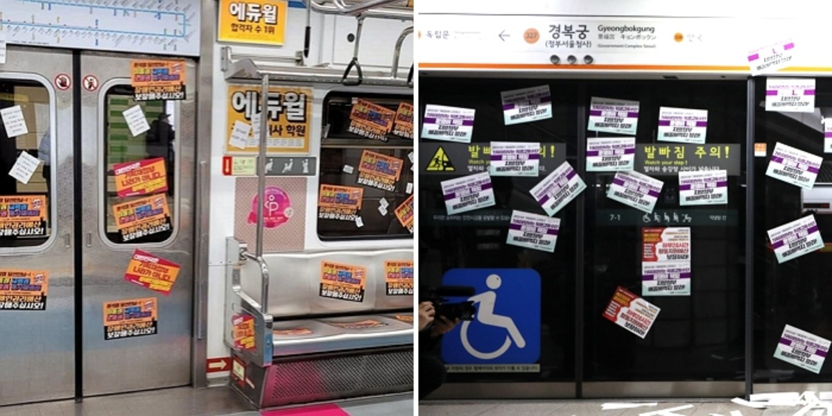 특히 지하철 벽면에는 스티커가 빈틈 없이 붙어 있어 원래의 벽이 하나도 보이지 않았다.