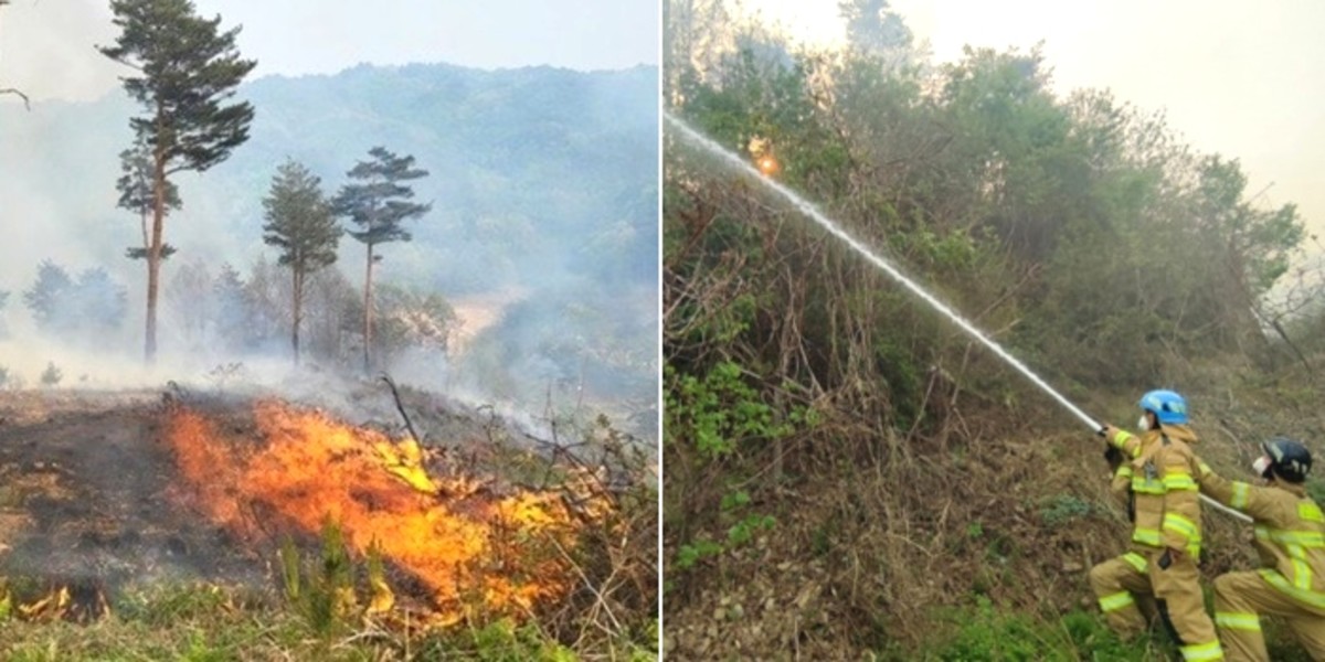 소방당국은 산불이 발생한 원일전리와 명지리 일대 민가로 불이 번지는 것을 저지하고 있다.
