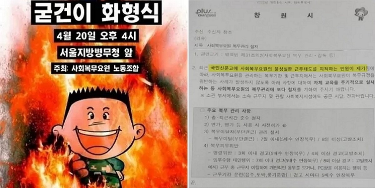한편 사회복무요원 노조는 지난 20일 서울지방병무청 앞에서 집회를 열었다. 이들은 노동 환경 개선과 관련 법정 경비를 요구했으며 병무청 마스코트 '굳건이'가 그려진 현수막을 태우는 퍼포먼스를 진행했다.