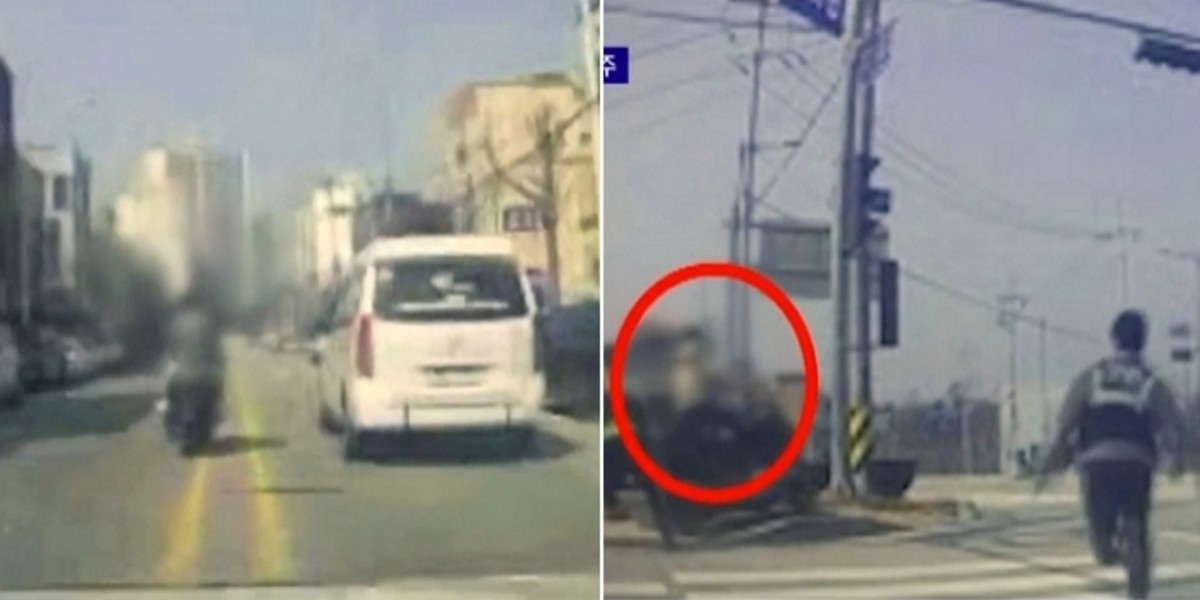 [인사이트] 박상우 기자 = 대낮에 신호를 무시하고 중앙선을 넘나드는 등 광란의 질주를 펼친 오토바이 운전자를 경찰이 몸을 날려 붙잡았다.