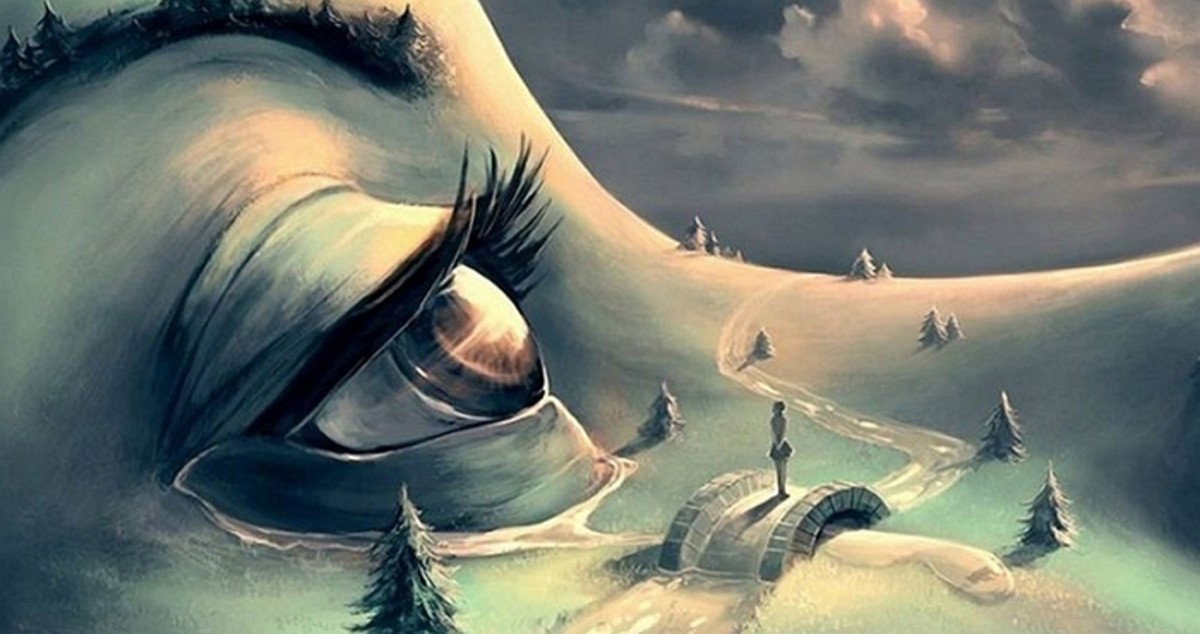그림에는 한 사람의 '커다란 눈동자'와 '다리 위에 서있는 소녀', '산과 나무'들이 그려져 있다.