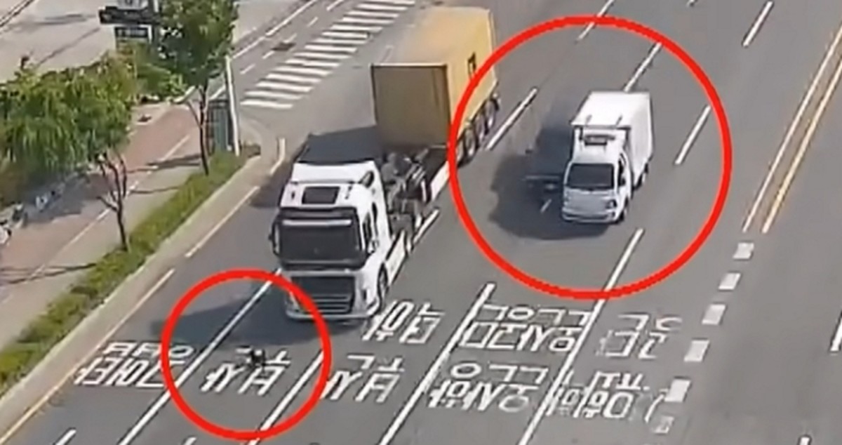 영상 속에는 한낮 왕복 10차로 도로를 무단횡단하는 강아지가 담겼다. 강아지 뒤로는 거대한 트레일러가 무서운 속도로 달리는 중이다.