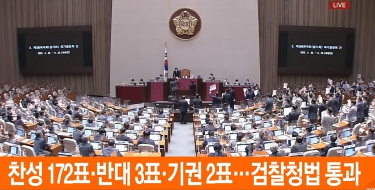 [인사이트] 성동권 기자 = '검수완박'(검찰 수사권 완전 박탈) 법안 중 하나인 검찰청법 개정안이 국회 본회의를 통과했다.