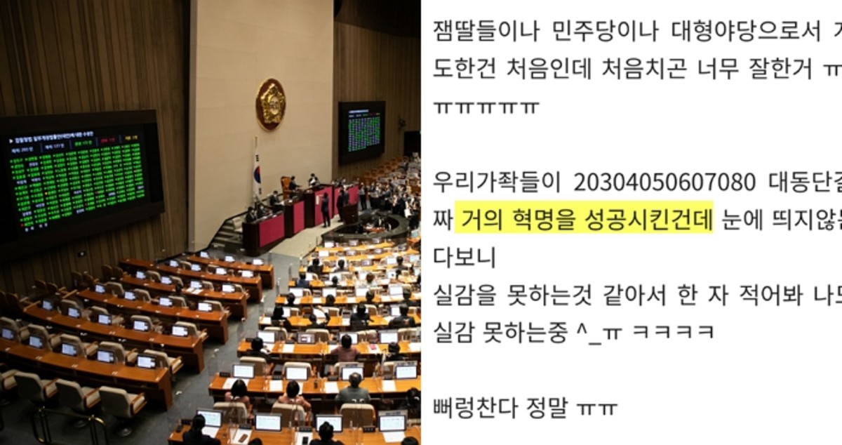 한 여초 커뮤니티에는 "잼딸(재명이 딸)들이나 민주당이나 대형 야당으로서 개혁을 주도한 건 처음인데 너무 잘했다"는 글이 올라왔다.