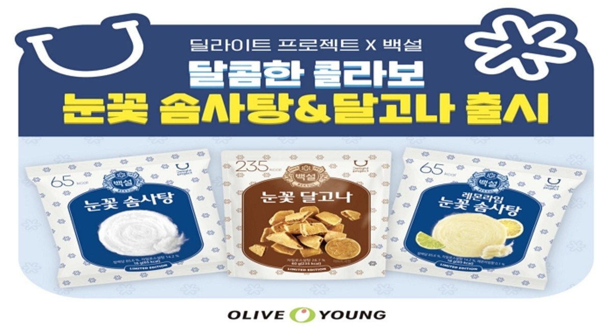 [인사이트] 김소영 기자 = CJ올리브영은 자체 식품 브랜드 '딜라이트 프로젝트'가 CJ제일제당의 대표 브랜드 '백설'과 손잡고 신제품 3종 '눈꽃 솜사탕', '레몬라임 눈꽃 솜사탕', '눈꽃 달고나'를 출시했다고 2일 밝혔다.