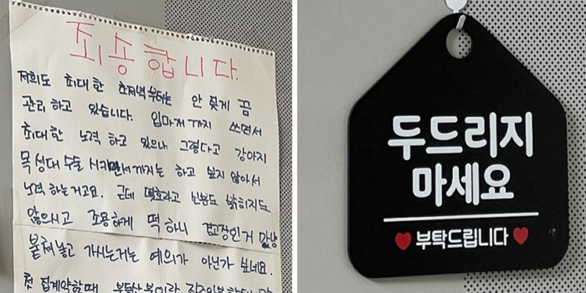 [인사이트] 유진선 기자 = 반려견 소음으로 이웃 항의를 받은 주민이 현관문에 써붙인 경고성 안내문이 포착돼 누리꾼들의 이목을 끌었다.