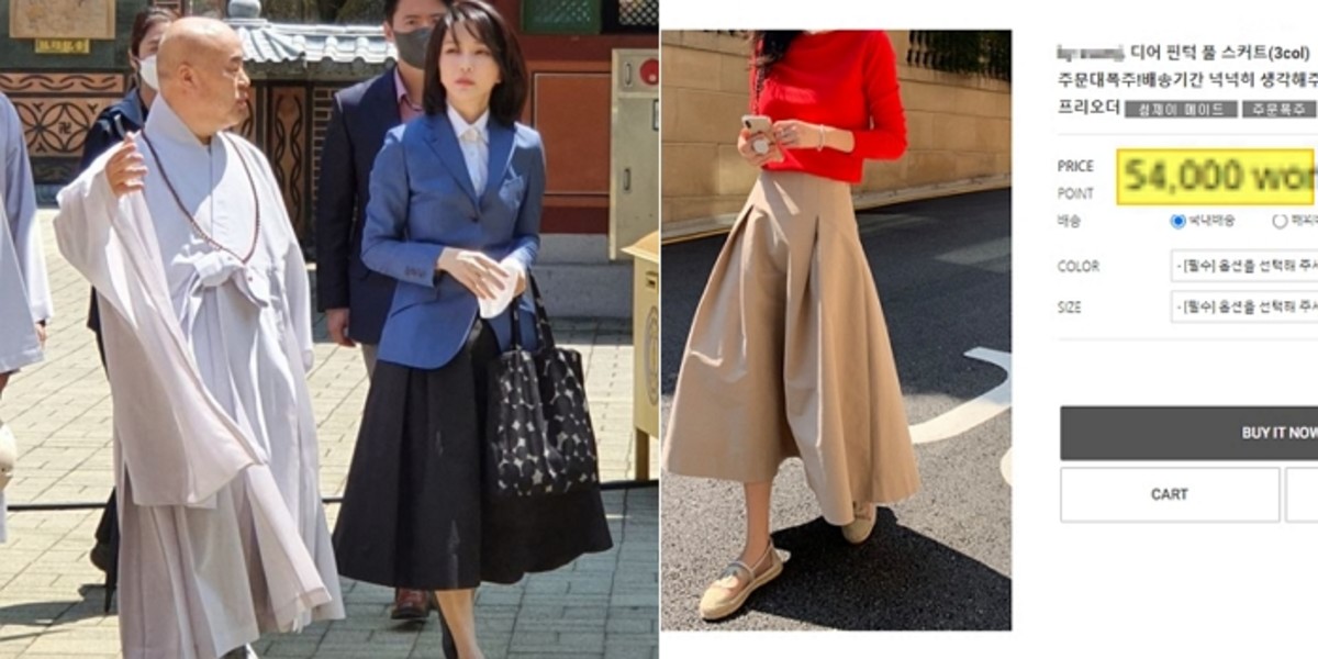 김 여사가 3일 충북 단양 구인사를 방문하면서 입은 치마가 인터넷 쇼핑몰에서 5만원대에 판매 중인 제품과 동일한 것으로 알려졌기 때문이다.