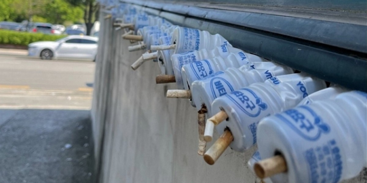 야구르트병 아래 부분에는 담배꽁초가 한두 개씩 꽂혀 있다. 야구르트병을 재떨이처럼 사용한 것으로 보인다.
