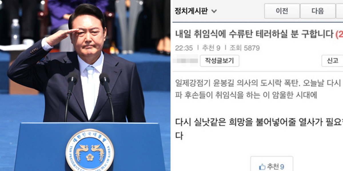 [인사이트] 김다솜 기자 = 윤석열 대통령 취임식에 수류탄 테러를 하자는 내용의 글이 온라인에 게재돼 경찰이 입건 전 조사에 착수했다.
