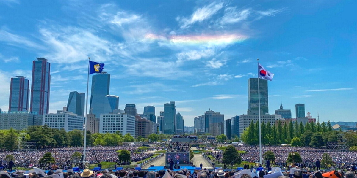 시민이 올린 영상 속 취임식 현장 하늘에는 맑고 화창한 날에는 거의 볼 수 없는 무지개가 떠있었다.