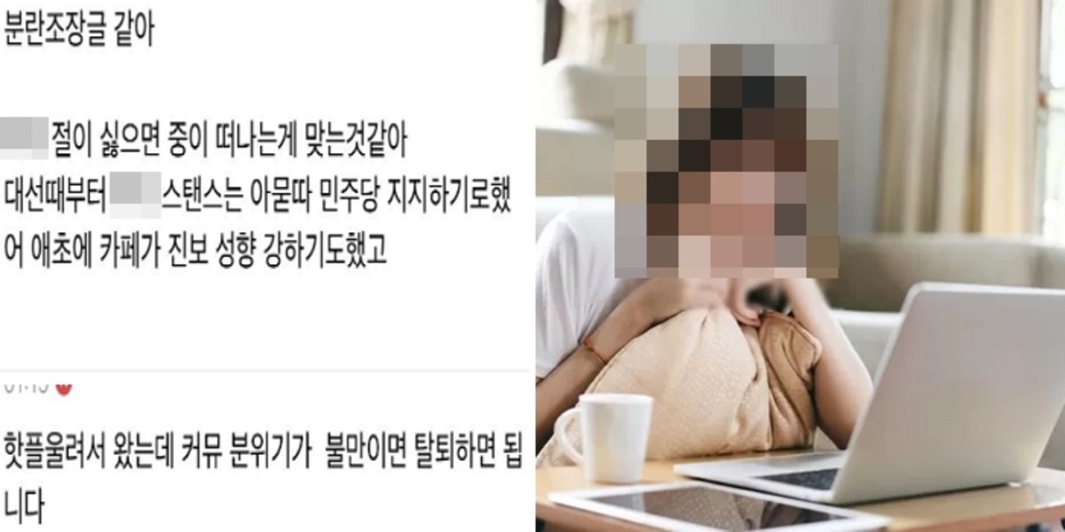 한 누리꾼 A씨는 "아묻따. (아 묻지도 따지지도 않고) 민주당 지지하는 모습을 보여야 한다", "애초에 카페가 진보 성향이다"라는 댓글을 달았다.