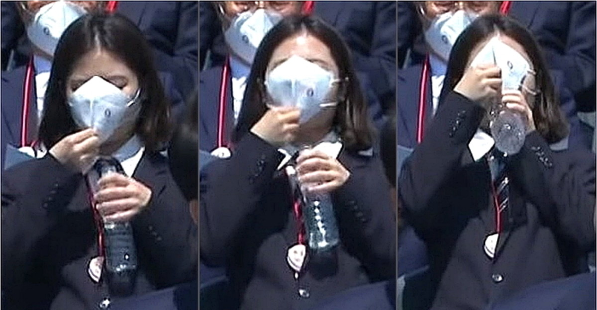 박 위원장은 취임식 도중 마스크를 위로 올려 물을 마시거나 눈을 감는 등의 모습을 보였다.