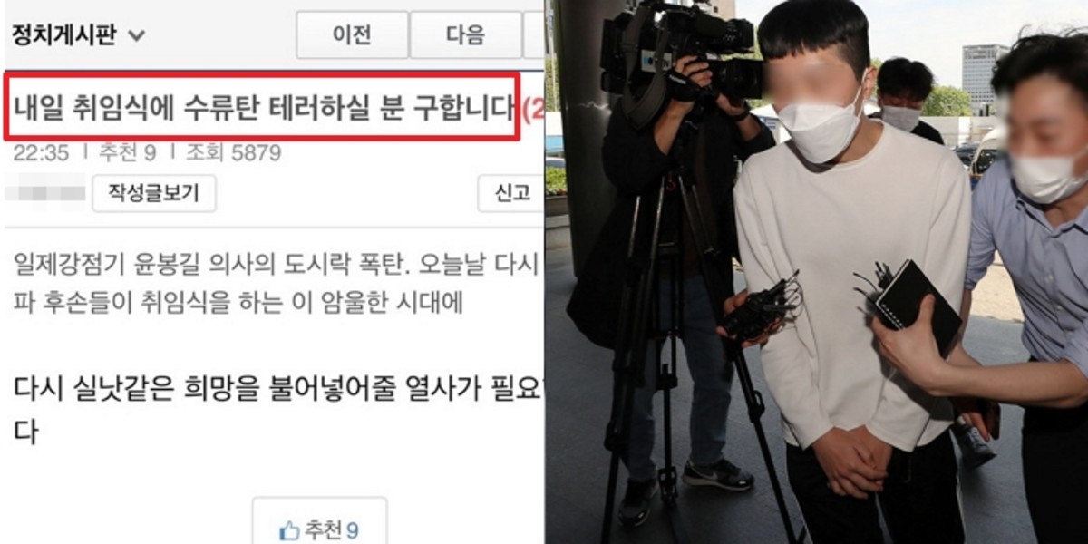 앞서 A씨는 9일 오후 10시 35분께 온라인 커뮤니티 '보배드림' 게시판을 통해 "내일 취임식에 수류탄 테러하실 분 구함"이라고 글을 올렸다.