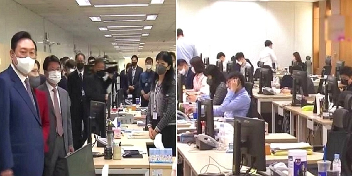 지난 11일 KTV 국민방송 유튜브 계정에는 용산 신청사에서 업무를 시작한 대통령실 직원들을 둘러보는 윤석열 대통령의 모습이 담긴 영상을 공개했다.