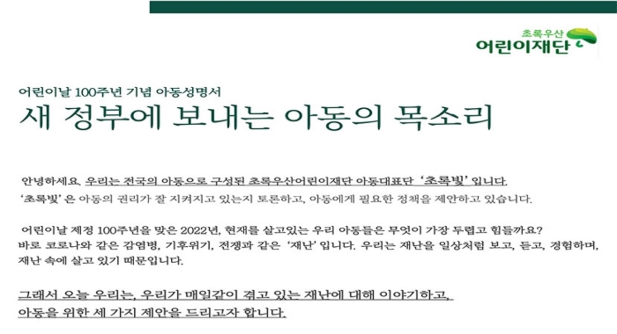 '새 정부에 보내는 아동의 목소리' 성명서는 초록우산어린이재단 공식 홈페이지를 통해 원문을 확인할 수 있다.