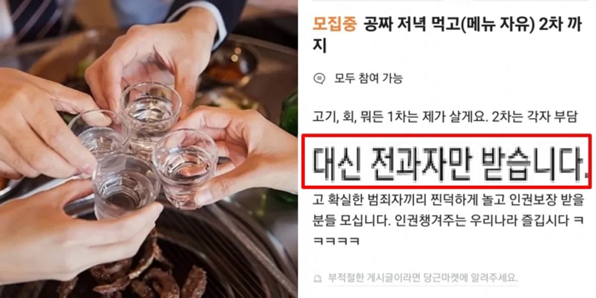 A씨는 "고기, 회 뭐든 1차는 제가 산다. 2차는 각자 부담이다"라면서 "대신 전과자만 받는다"라고 적었다.