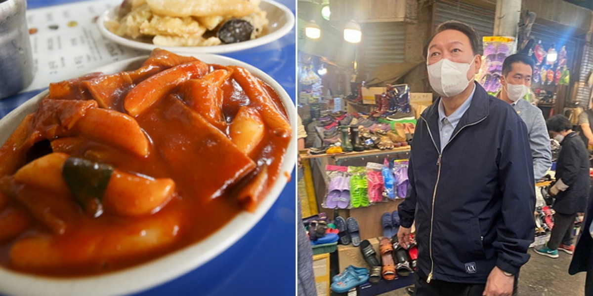 윤 대통령은 광장시장 단골 식당을 찾아가 마약김밥과 칼국수를 먹으려 했는데, 사람이 꽉 차 있어 그러지 못했다.