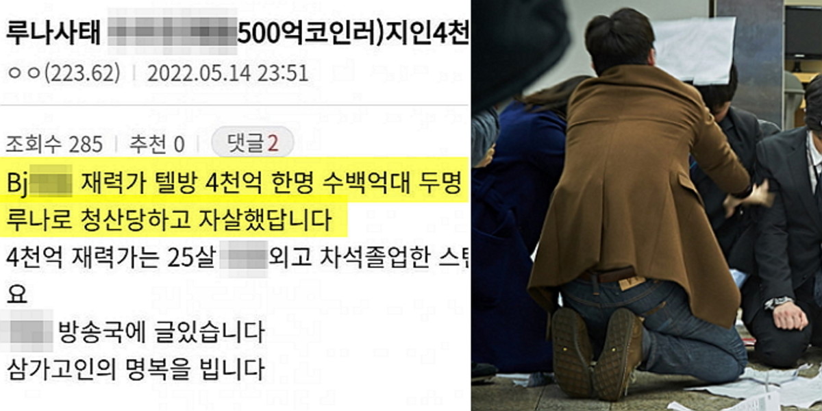 이런 가운데 코인 BJ 쪽에서는 전설로 추앙받는 한 BJ의 지인 세 명이 모두 루나를 가지고 있다가 자산이 삭제돼 스스로 목숨을 끊었다는 내용의 글이 온라인 커뮤니티에 올라왔다.