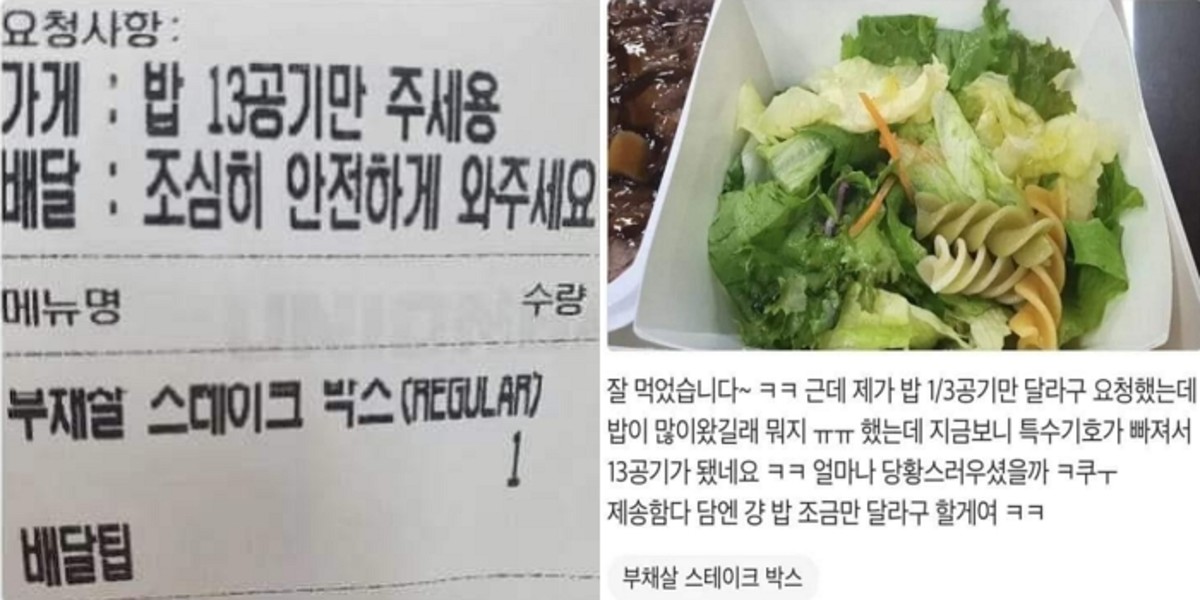 실제로 A씨가 올린 영수증 요청사항을 보면 "밥 13 공기만 주세요"라고 적혀있다.
