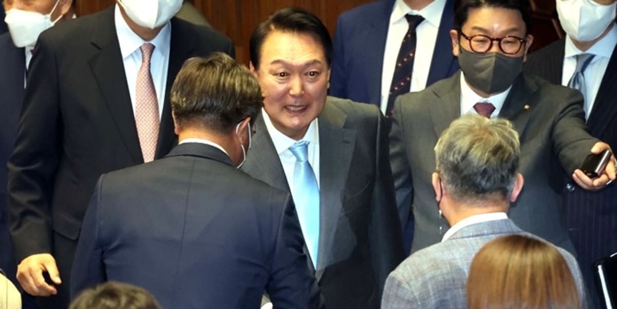 [인사이트] 이원선 기자 = 윤석열 대통령이 첫 국회 시정연설에서 야당인 더불어민주당 의원들과 일일이 악수를 나눴다.