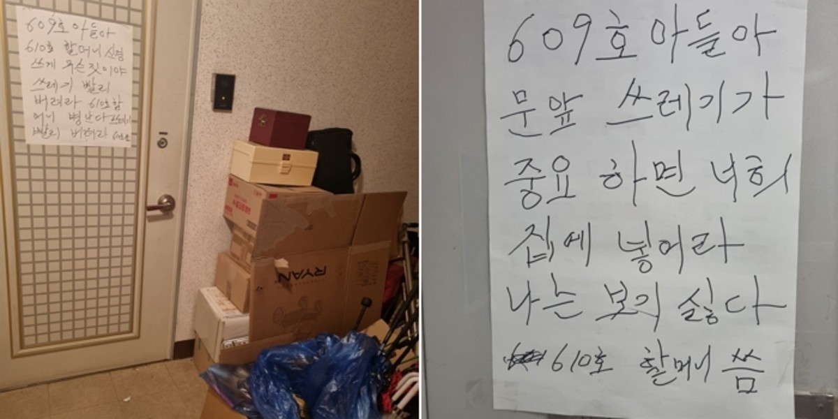 쪽지에는 삐뚤뺴뚤한 글씨로 "609호 아들아. 문앞 쓰레기가 중요하면 너희 집에 넣어라. 나는 보기 싫다. 610호 할머니 씀"이라고 적혀있다.