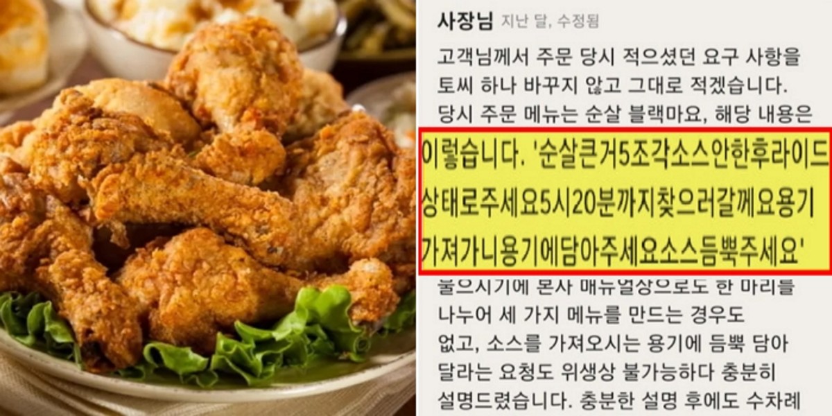 사장에 따르면 고객은 순살 양념 치킨을 시키며 "순살 큰 거 5조각 소스 안 한 후라이드 상태로 주세요. 5시 20분까지 찾으러 갈게요. 용기 가져가니 용기에 담아주세요. 소스 듬뿍 주세요"라고 요청했다.