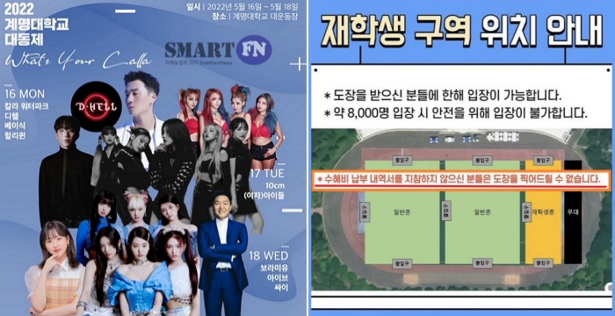 [인사이트] 임우섭 기자 = 계명대학교 축제가 호화로운 연예인 라인업으로 화제가 된 가운데 수혜비(학생회비 등)를 안 낸 재학생들에게 좌석을 차별화하겠다는 공지를 써 올려 불만을 샀다.