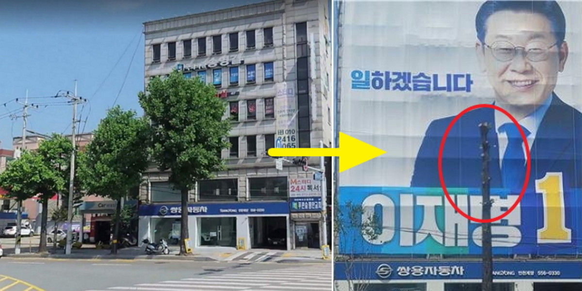 가로수 뒤에 자리 잡고 있는 이 후보의 얼굴이 담긴 커다란 현수막은 선명하게 보인다. 나무에 가지치기가 된 덕분에 길을 지나는 사람들이 한눈에 볼 수 있다.