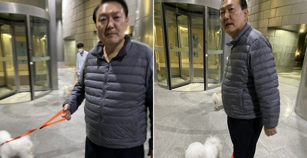 이날 윤 대통령은 회색 패딩 점퍼와 검은색 바지를 입은 채 자택 건물 1층을 나서 반려견과 함께 산책을 하려는 장면이 담긴 사진 세 장이 공개됐다. 이 과정에서 수행원으로 보이는 한 남성이 사복 차림으로 윤 대통령의 또 다른 반려견으로 보이는 강아지와 함께 있는 모습이 잡히기도 했다.