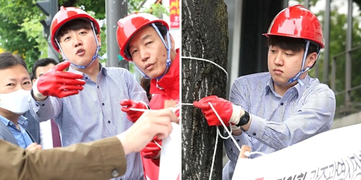 이 대표는 실제로 다음날 직접 장갑과 헬멧을 착용한 채 가로수에 현수막을 설치했다.