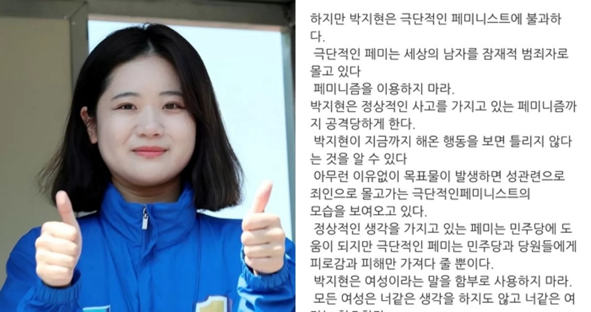 게시판에 게재된 박 위원장 비판 그들을 보면 "우리는 페미에게 투표한 게 아니다", "박지현은 민주당에 어울리지 않는다", "박지현은 극단적인 페미니스트에 불과하다", "페미니즘을 이용하지 마라" 등의 내용이 담겨 있다.