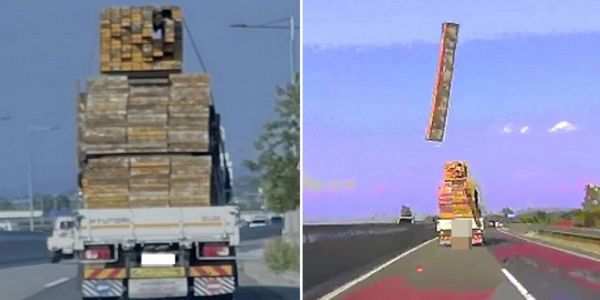 날라온 목재에 놀란 운전자는 서서히 도로에 멈춰 섰지만 화물차는 멈추지 않고 그대로 가버렸다.