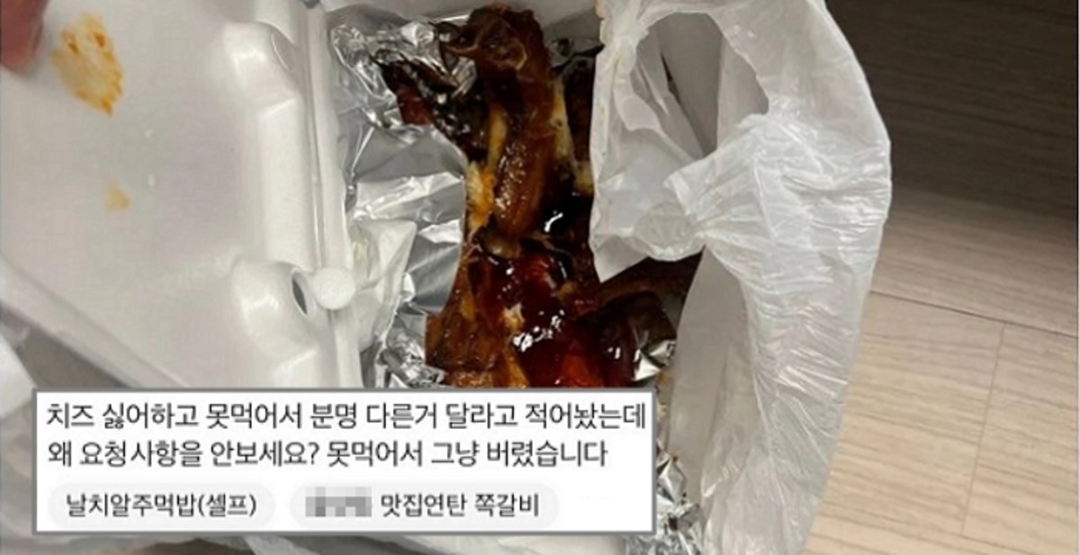 그는 요청란을 통해 '치즈 싫어한다. 못 먹어서 다른 거 달라'고 적었다. 하지만 집으로 배달 온 쪽갈비에는 이벤트 화면에 보인 그대로 눈꽃 치즈가 사르르 뿌려져 있었다.