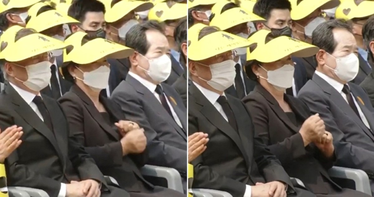 가만히 앉아 노래를 들고 있던 문 전 대통령과 정 이사장과는 사뭇 비교되는 모습이었다.