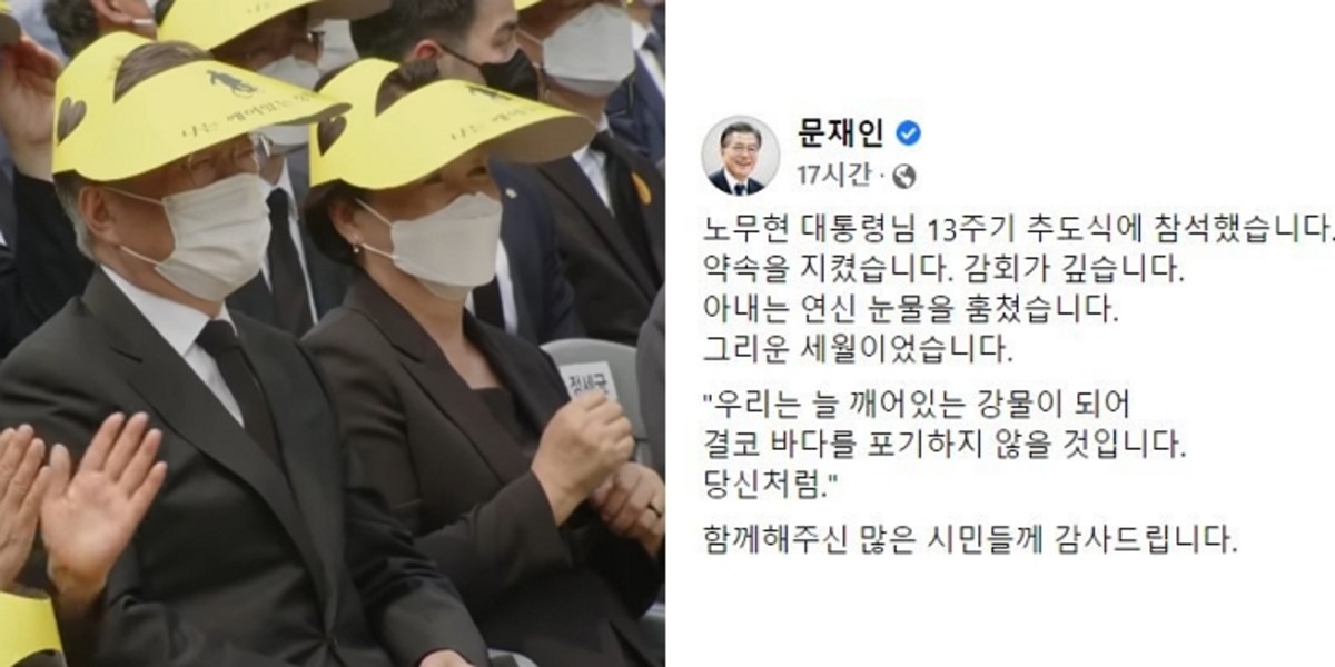문 전 대통령은 이날 페이스북을 통해 "노무현 대통령님 13주기 추도식에 참석했습니다. 약속을 지켰습니다. 감회가 깊습니다"라고 밝혔다.