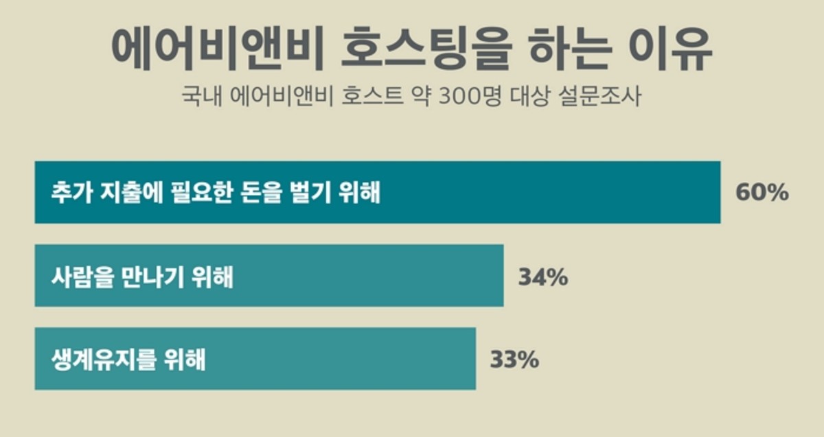 국내 에어비앤비 호스트 약 300명을 대상으로 한 설문조사에서 응답자 가운데 60%는 추가 지출에 필요한 돈을 벌기 위해 에어비앤비 호스팅을 하고 있다고 답했다. 응답자의 3분의 1은 생계 유지를 위해, 5명 중 1명 이상의 호스트는 생활비 마련을 위해 호스팅을 한다고 응답했다. 국내 호스트 중 에어비앤비 호스팅이 주 수입원에 해당된다고 답한 비율은 45%였다.